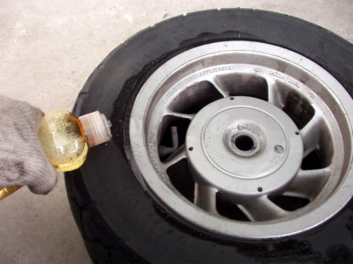 エアバルブのムシ抜きツールを使って空気を抜き、シリコンスプレーを隙間に吹きつけました。