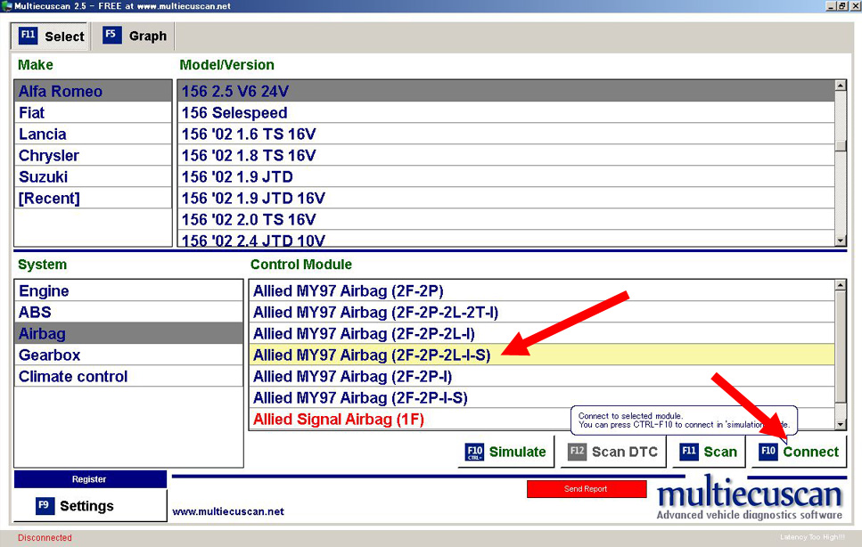 「multiecuscan」にてエアバッグ接続をスキャン。