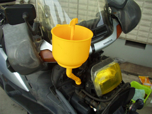延長パイプを組み付けて差し込み、そこに冷却液を注入。ファンネル部分に僅かにたまるくらいまで注いだら、エンジンを始動し、水温が上がってサーモスタットが開き、冷却系路全体に液が行き渡り、エアが抜けるまでしばらくアイドリングを行いました。