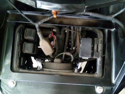 フロントカバーリッドを取り外すと、ヘッドライトやフロントウインカーへの配線や、リレー類にアクセスができます。
