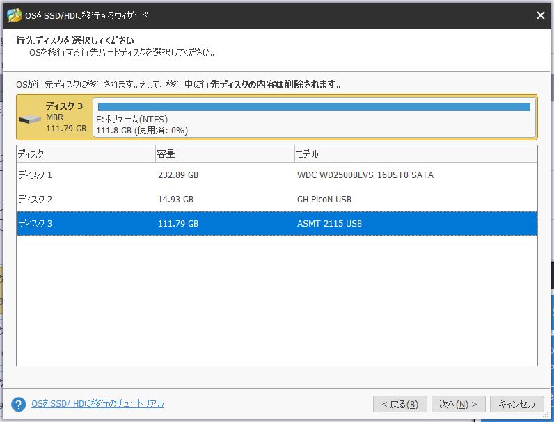 インストール後、SSDのUSB接続、OSの移行を選択。