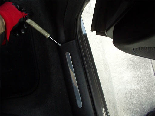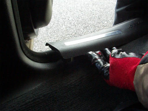 後部座席側からスカッフプレートを浮かせてスペースを作ります。