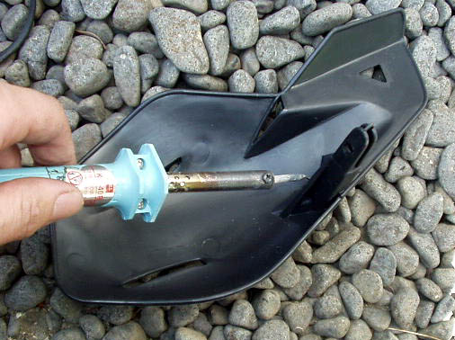 汎用品ですので取り付け穴の位置が合いません。取り外したフェンダーに合わせてハンダゴテで溶かして穴を開け、リーマーで拡大しました。
