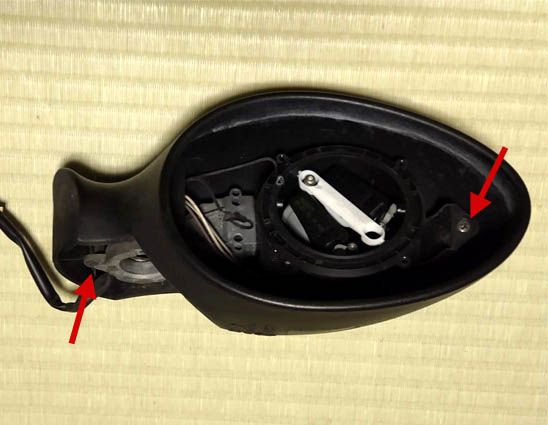 ミラー可動部のかみ合わせを固定するばねの基部が外れています。