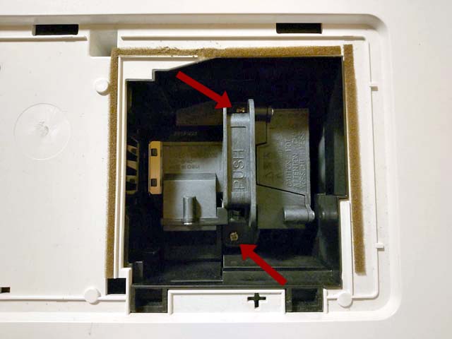 本体背面奥にあるスイッチをマイナスドライバー等で押すと、上面パネルが開きます。
