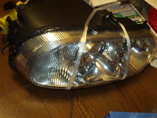 左側のレンズは黄ばみが酷いため再利用を断念。純正ライトのレンズを移植することにしました。