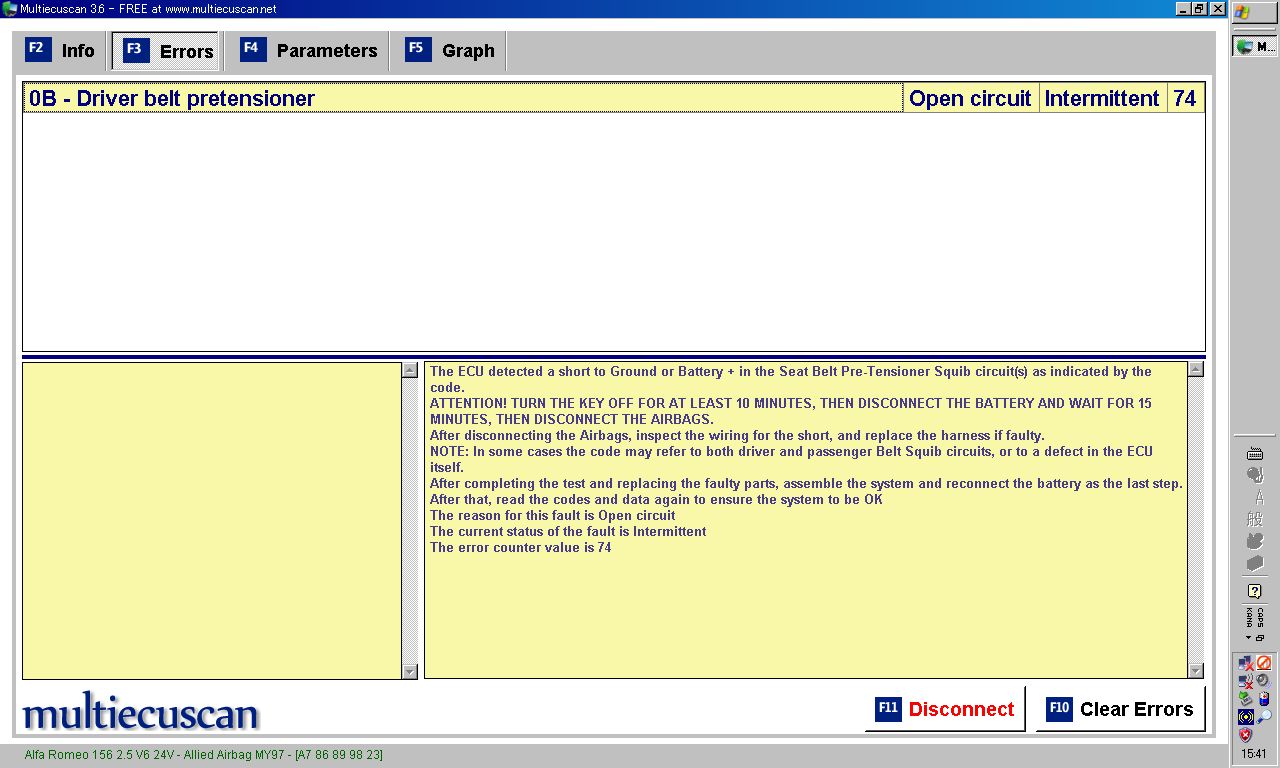 「Driver belt pretensioner」のエラー「Open circuit」が「Present」から「Intermittent」になっています!
