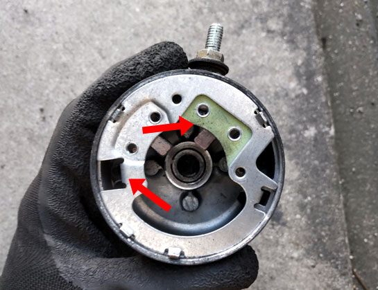 分解してみると、純正カーボンブラシも割れていました。更にカーボンブラシ接触面の電極も荒れた状態になっていました。