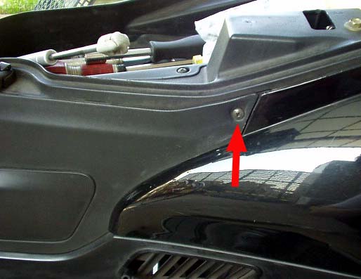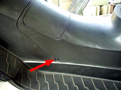 左サイドスカートの取り外し。二か所のプラスねじと二か所のピンを外します。