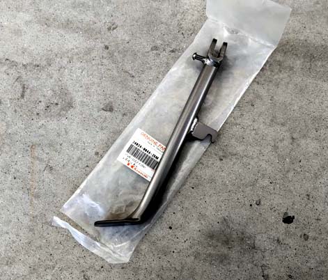 KSR110のサイドスタンド。フレームの塗装色などに比べて、マフラー用耐熱シルバースプレーのような軽くて安っぽい銀色で好きではありませんでした。