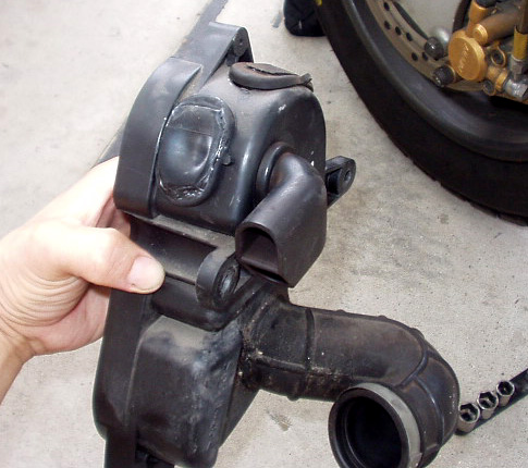 キャブセッティングのためいろいろと加工して穴だらけにしたエアクリーナーボックス取り外し。