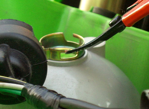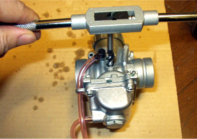 ノーマルキャブ取り外しにあたり、燃料タンクのコックをオフにし、キャブ内のガソリンも抜いてしまいます。