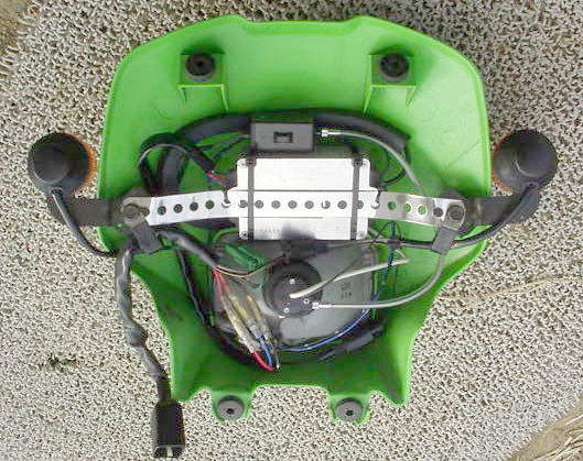 フロントマスクの固定ネジ、メーターの固定ネジ、スピードメーターケーブルを外します。