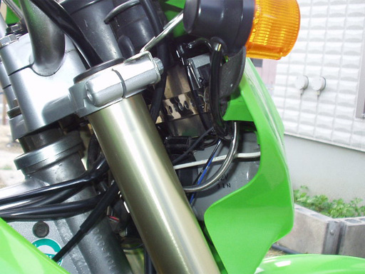 両面テープでの貼り付けだけでは心もとないため、汎用ステンレス金具をウィンカーステイに共締めし、インバーターを両面テープとタイラップでしっかり固定します。