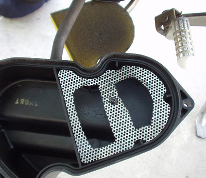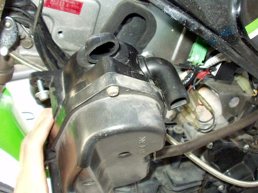エアクリボックスのKLX110ブタ鼻を撤去。また、ボックスに穴を開け、KSR110ブタ鼻を付けて吸気量確保。