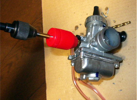 貫通してキャブ自体をオシャカにしないよう、ストッパーを付けたドリルで、5.5/6.0/6.5と穴を大きくしていき、M8 ピッチ1.25mmのタップを切るのに必要な6.8mmまで広げていきます。