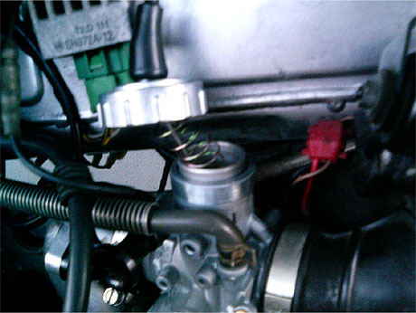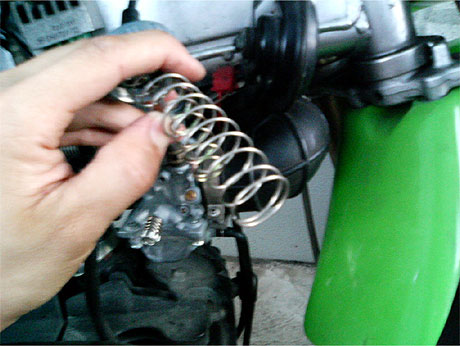 VM26のスロットルスプリングは強さが足りず、張り付きの原因になるとの情報があり、ノーマルキャブのスプリングに取り替えています。少々重くなります。