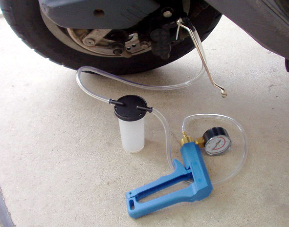 ポンプを握って負圧をかけ、排出ニップルを緩めると、劣化したブレーキフルードが吸いだされます。