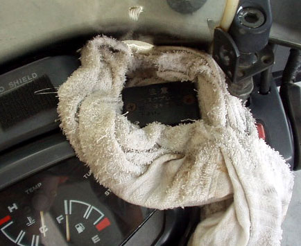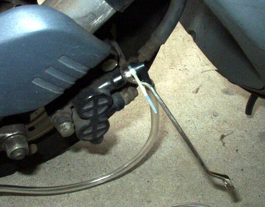 ブレーキフルードは樹脂や塗装面を侵すため、水に湿らせたウェスをシリンダー周りに巻いておくと安全です。