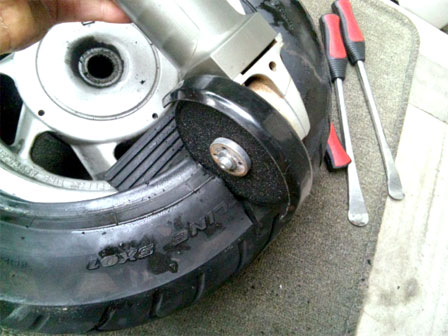 用意したタイヤ付きホイールを逆の手順で取付けます。