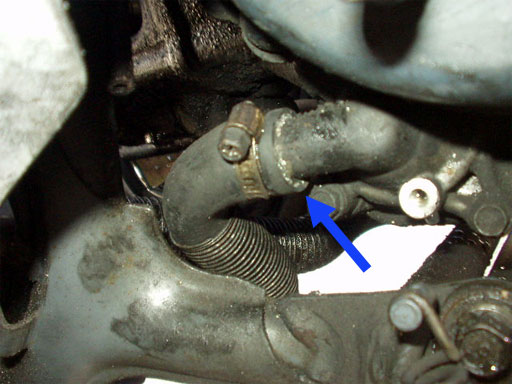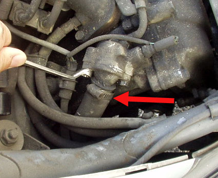 サーモスタットはこの位置に収まっています。8mmのめがねレンチでボルトを緩めて外しました。