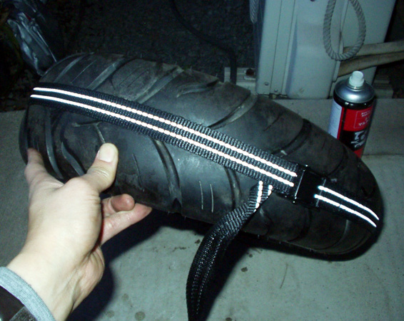 普通にホイールにはめても全くビードが上がらないので、潰して縛ってクセをつけてからはめ込み。