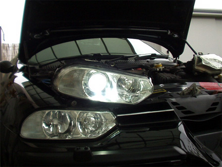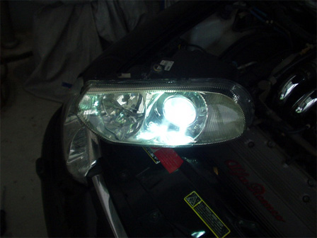とりあえず左右ともチェック。無事点灯して一安心ですが、取り付けされているバーナーはちょっと青すぎるみたいです。