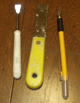 まずはレンズ外し。用意したのは左から 内張り剥がしこて・スクレイパー・アートナイフ