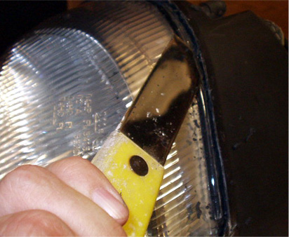 まずアートナイフで全周切込みを入れ・スクレイパーでシリコンゴムを掻き取り・コテでこじ開ける