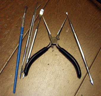 細工用スパチュラで削り落とし、ペンチでつまんで千切ります。筆はリフレクタのホコリを払うのに使いました。