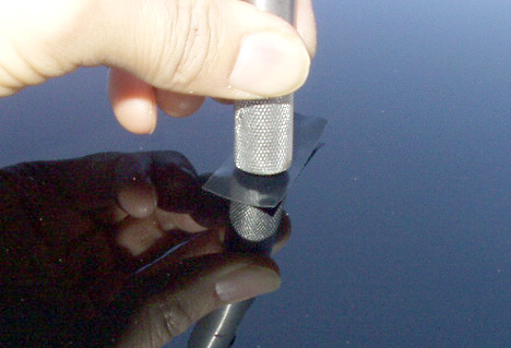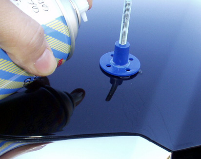 付属のグルースティックを引き出し器具に付け、凹みの最も低い場所に貼り付け。糊は5分ほど放置して冷却をするよう取説にはありますが、時間短縮のため、コールドスプレーで冷やし固めます。