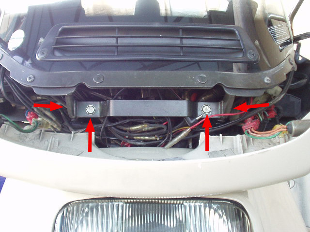 ミラー交換、ハンドル周り補修に際して、まず4箇所のネジとウインカー配線を外し、ハンドルカウル取り外し。