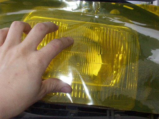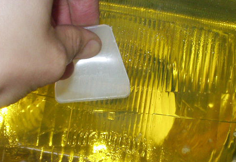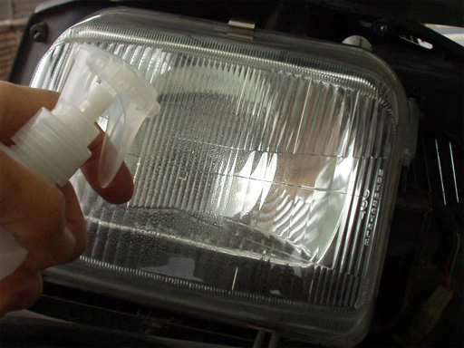 ライト表面に石鹸液をスプレーしてフィルムをあてがい、へらで水分を押し出し密着させました。