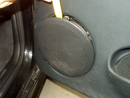 スピーカーカバーを樹脂製内張り剥がしで手前に引っ張って取り外し