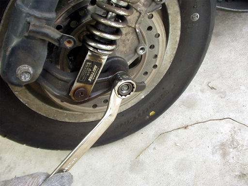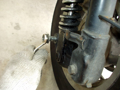 アスクルシャフトを留めるナットをサイズ19のめがねレンチで緩め、抜き取りました。