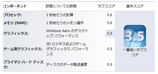 システムの評価にて、Windows Aeroデスクトップパフォーマンスは3.8→3.5 許容範囲です。