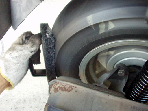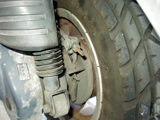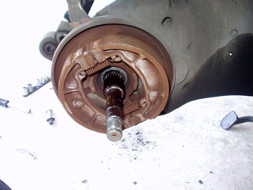ホイールを外すと、摩耗したブレーキシューが現れます。
