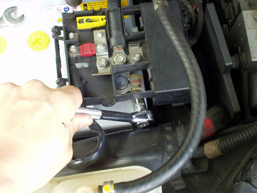 マイナス端子→プラス端子の順に取り外し、固定バンドも外してバッテリー降ろし。