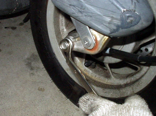 スピードメーターのギアをはめ込み、ブレーキパッド間を広げてディスクを収め、シャフトを挿入。