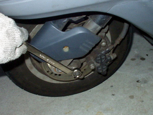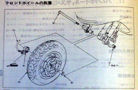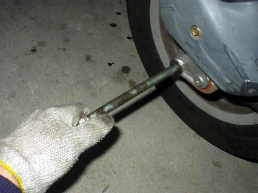 アスクルシャフトを14サイズのレンチで固定、ブレーキディスク側ナットを19サイズのめがねレンチにて取り外し、シャフトを引きぬくことでホイールを取り外すことができます。