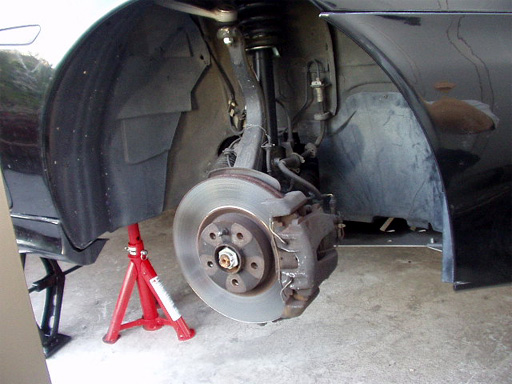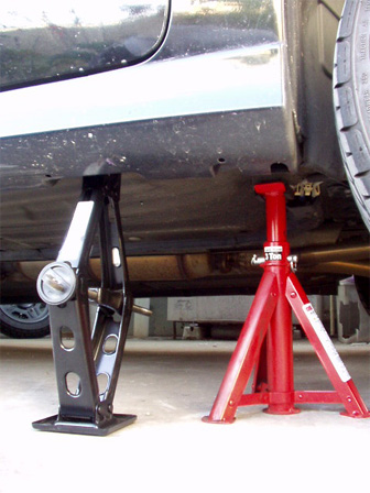 ジャッキアップした、車両の下に潜る際は、必ずスタンドを掛けて下さい。