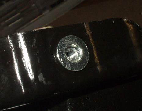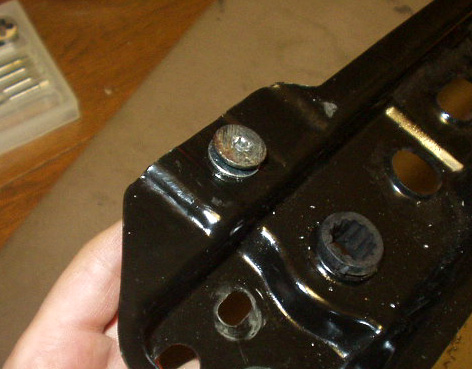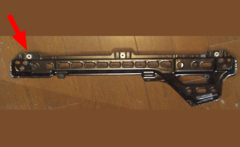 取り外したクロスレール。アンダーパネルの調節範囲を超え、斜めにボルトを入れ無理に留めたため、ネジ穴が効かなくなってしまっています。
