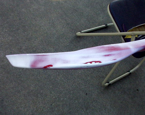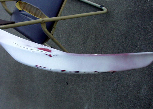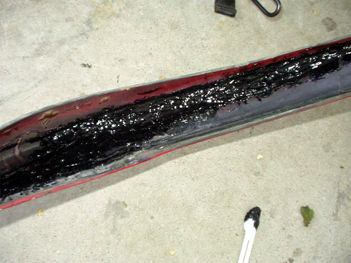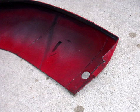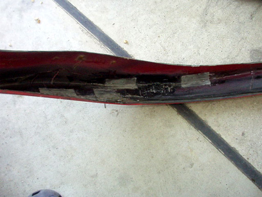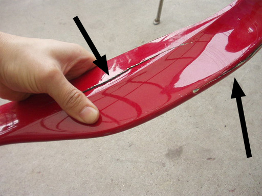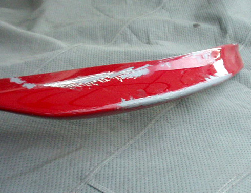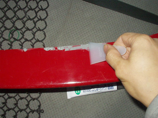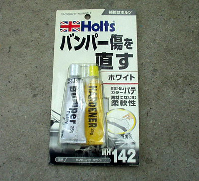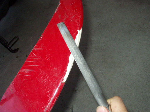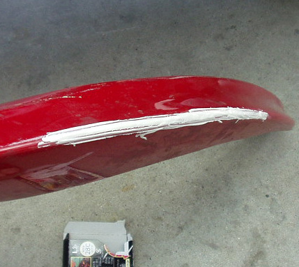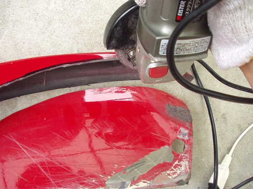表より目につく割れには、二液式のバンパーパテを塗りつけ、おおまかに削り出し。