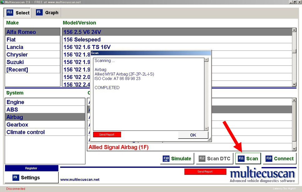 「multiecuscan」にてエアバッグ接続をスキャン。