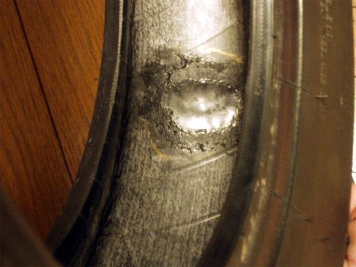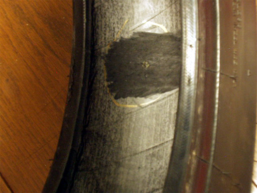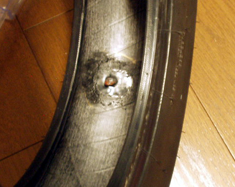 ホイールから外して、破綻部を確認。裂け目が大きくなってしまっています。