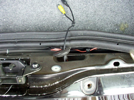 そこをふさいでいるグロメットを切り開いて、ナンバー灯線と一緒に固定します。