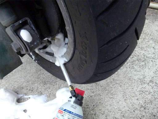 前もってタイヤからは空気を抜いておき、エアバルブにねじ込んで注入。
