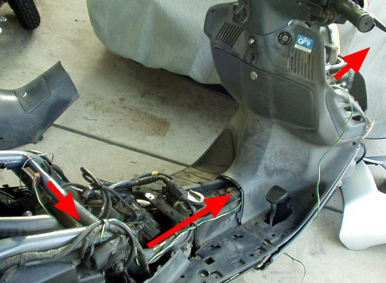 バッテリーからプラス線を辿って、ワイヤーハーネスのどこで断線が起こっているのかを確認したところ、バッテリーからメインスイッチのカプラまでバイパス線を引いてみると呆気無く、すべての動作が正常になりました。