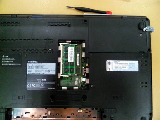 プラスドライバーでネジを緩めフタを開けると、2GBのDDR3メモリが一枚挿されていました。