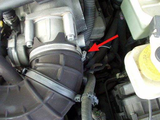 矢印のホースバンドを緩めてパイプをスロットルボディから外します。